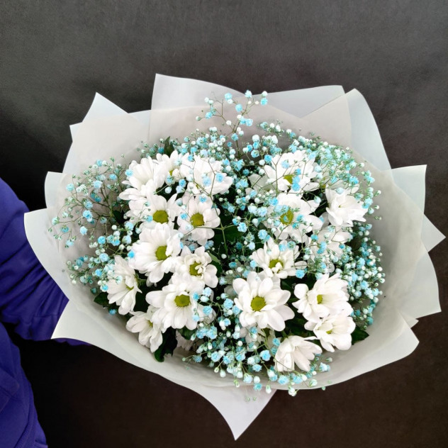 Милый букет из белой хризантемы и гипсофил! Прекрасно украсит любое ваше событие, и подарит море улыбок! Состав Хризантема - 5 шт. Гипсофила - 5 шт.