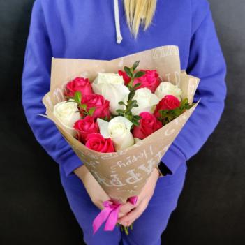 Классический букет из красно-белых роз в оригинальной упаковке.