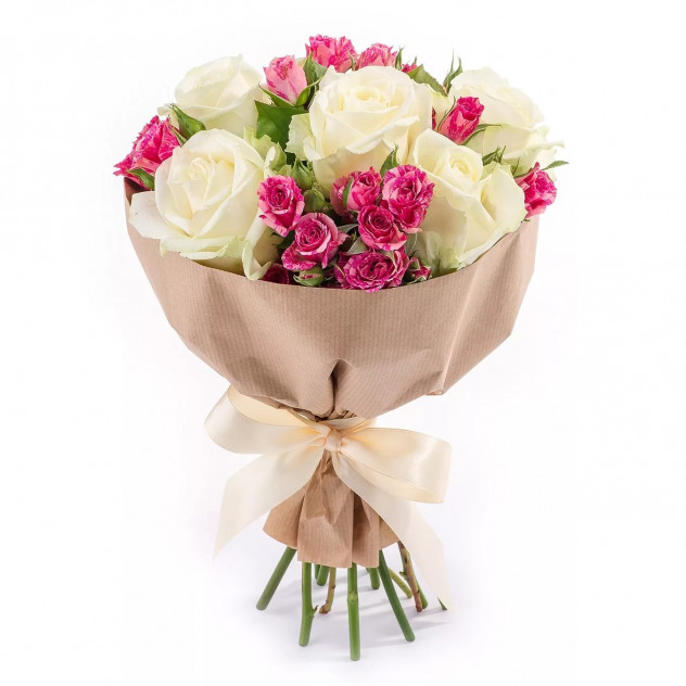 Упаковка для букета: крафт-бумага, Роза белая 60 см 7шт., Роза кустовая 8шт., Салал 5шт.