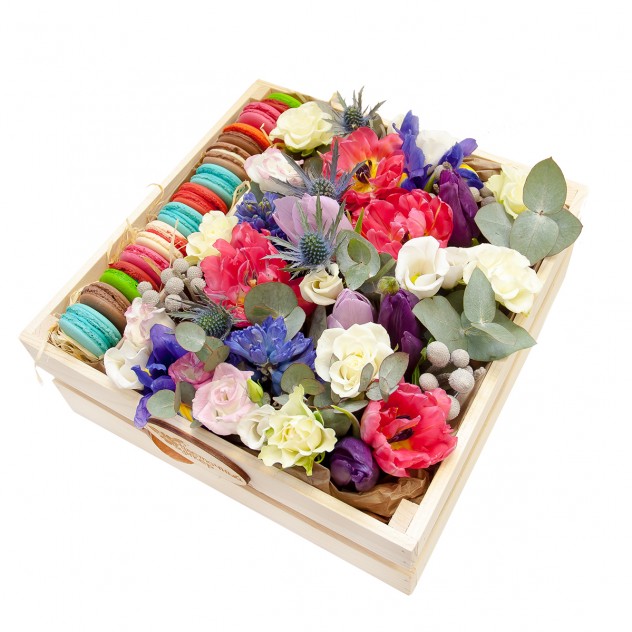 Состав: ящик 30*30 см, макаруни (12), сезонные цветы на вкус флориста.