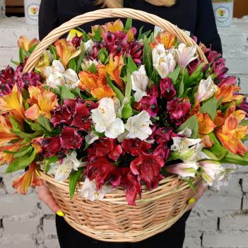Состав: Упаковка для букета: прозрачная пленка с лентой, Гербера 15шт., Рускус 20шт., Корзина плетеная, Пиафлор (оазис)