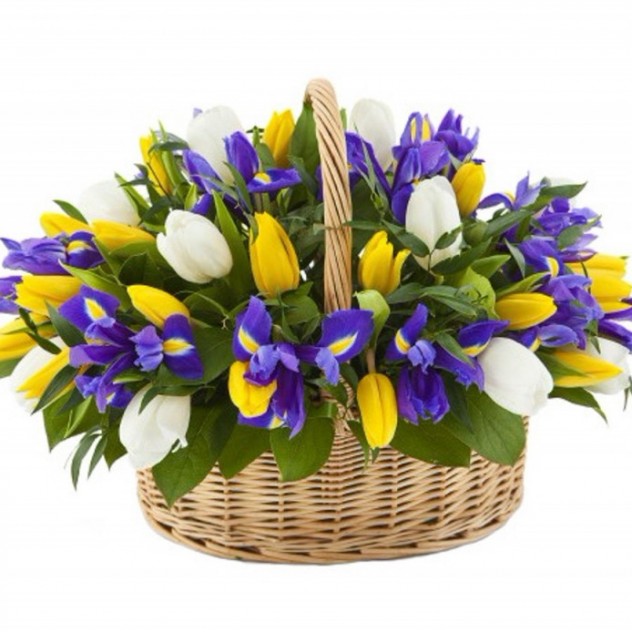 В нашей корзине с ирисами и тюльпанами вы найдете идеальный подарок на любой праздник!