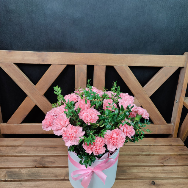 Пышная, ароматная, композиция из диантуса и эвкалипта в шляпной коробке и стильном дизайне.